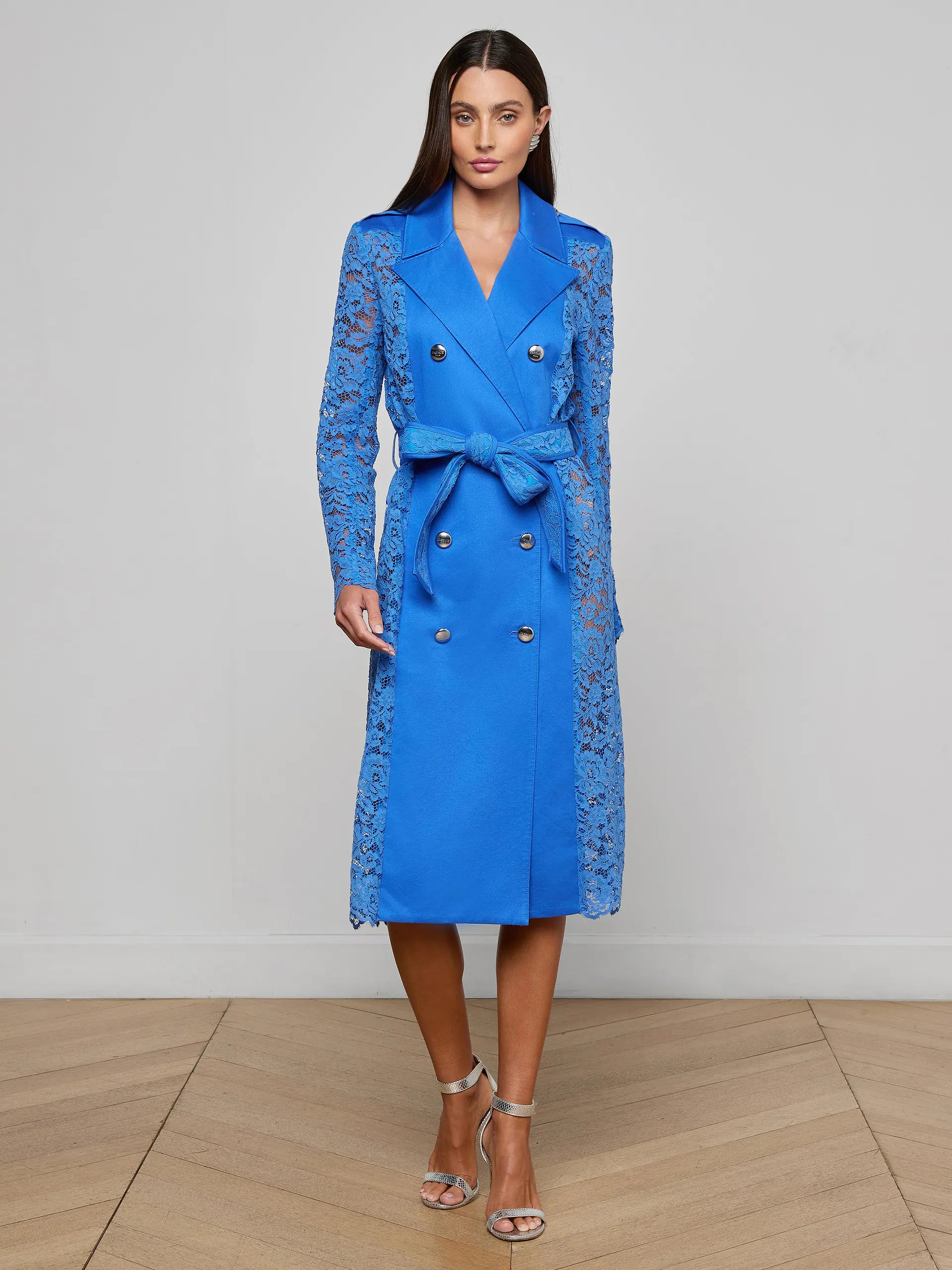 This sheer lace trench coat puts a feminine spin on a classic, blending timeless tailoring with romantic details. Pair the Amata with a coordinating slip to style it as a dress or pair it with jeans and a camisole as the ultimate statement layer. Now back in regatta blue.