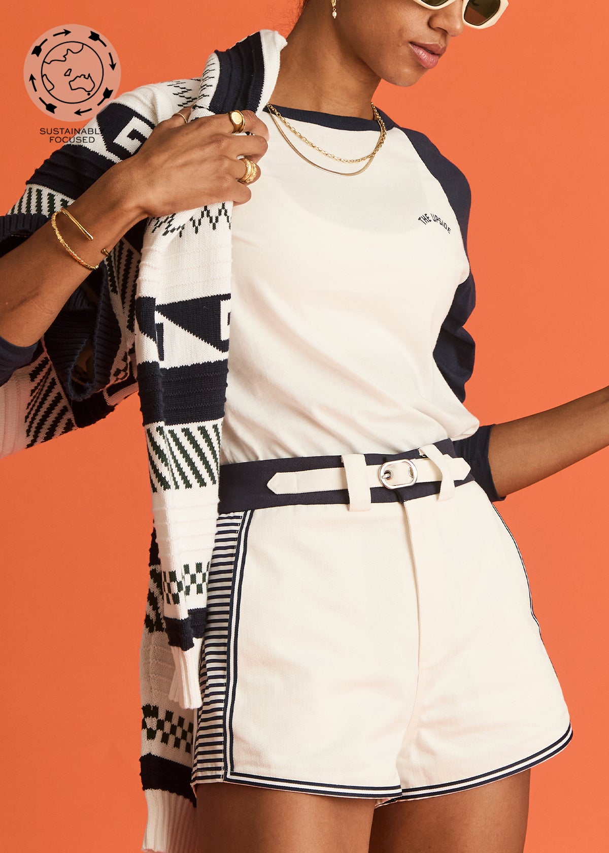 - Navy waistband with built in belt detail at front with metal buckle